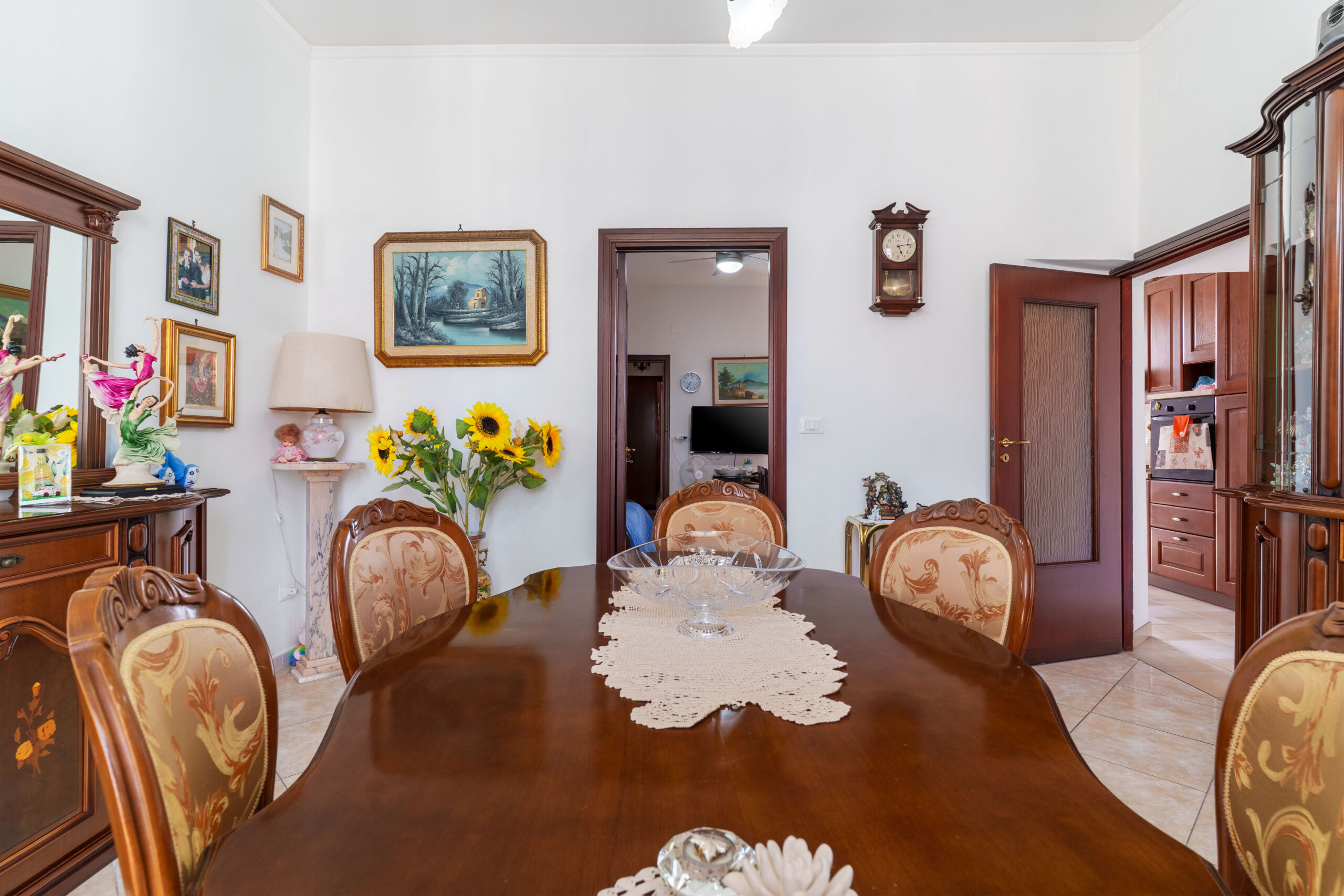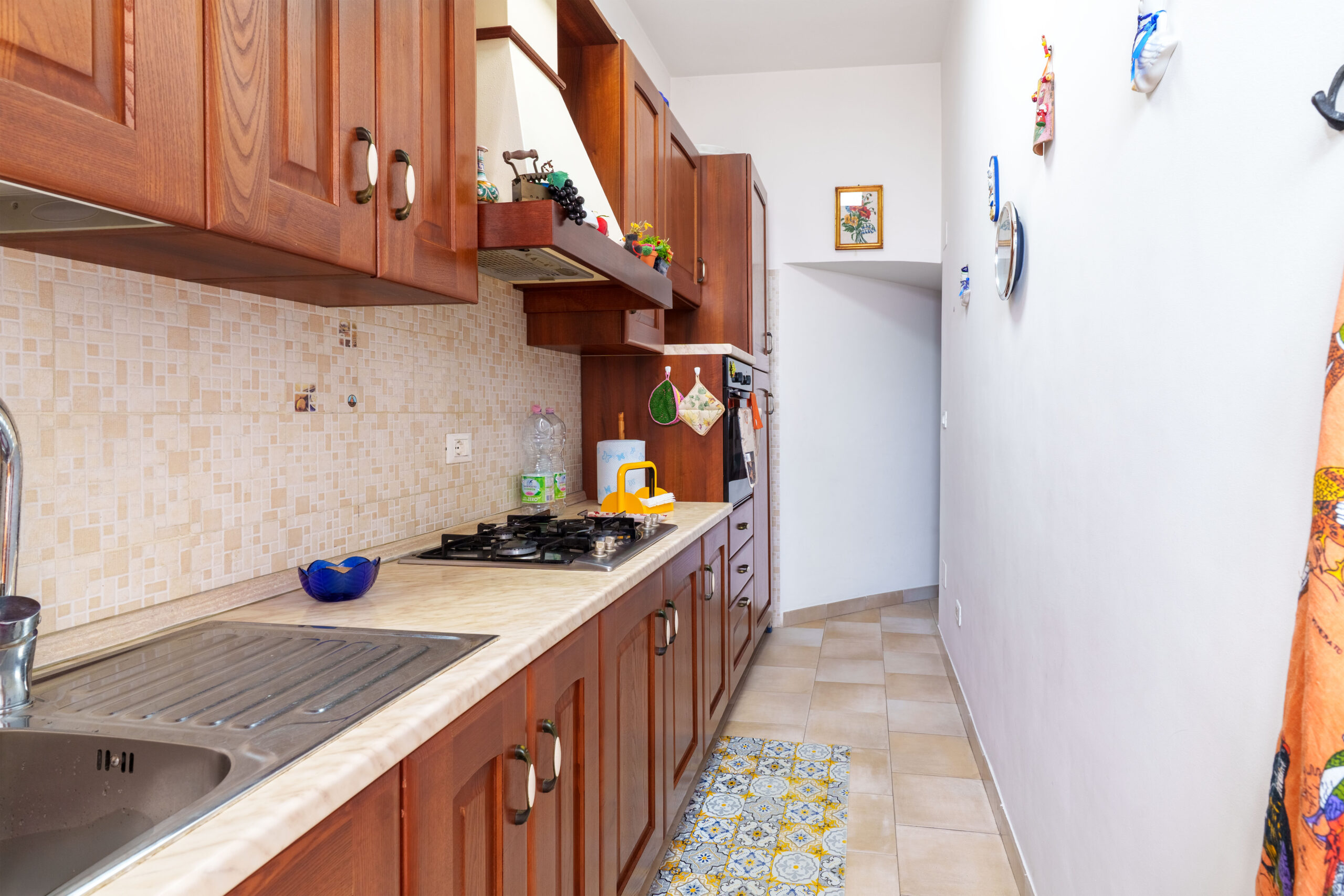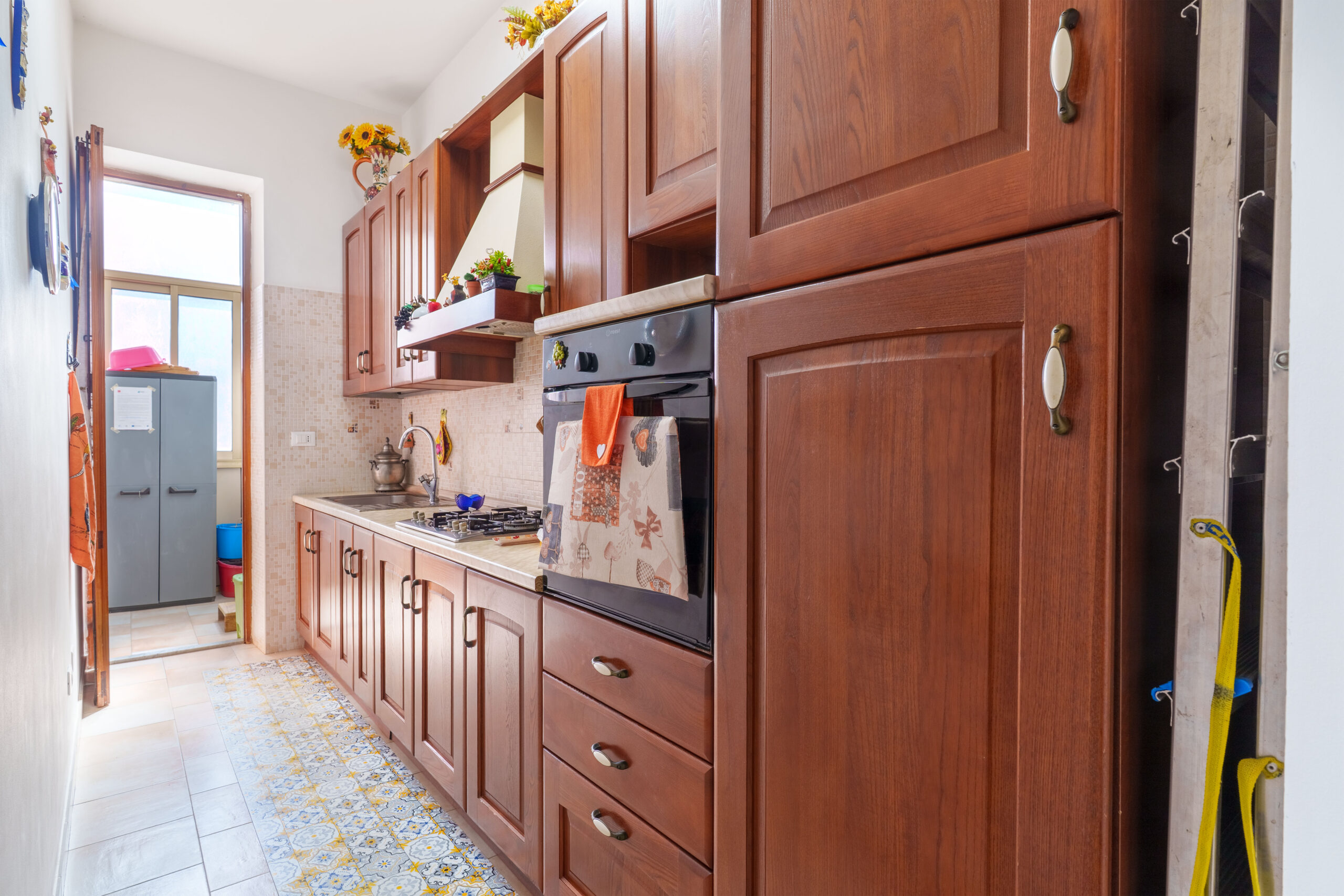 L’appartamento è dotato di porta d’ingresso blindata, porte e infissi in legno con persiane, pavimenti misti in marmo e cementine.