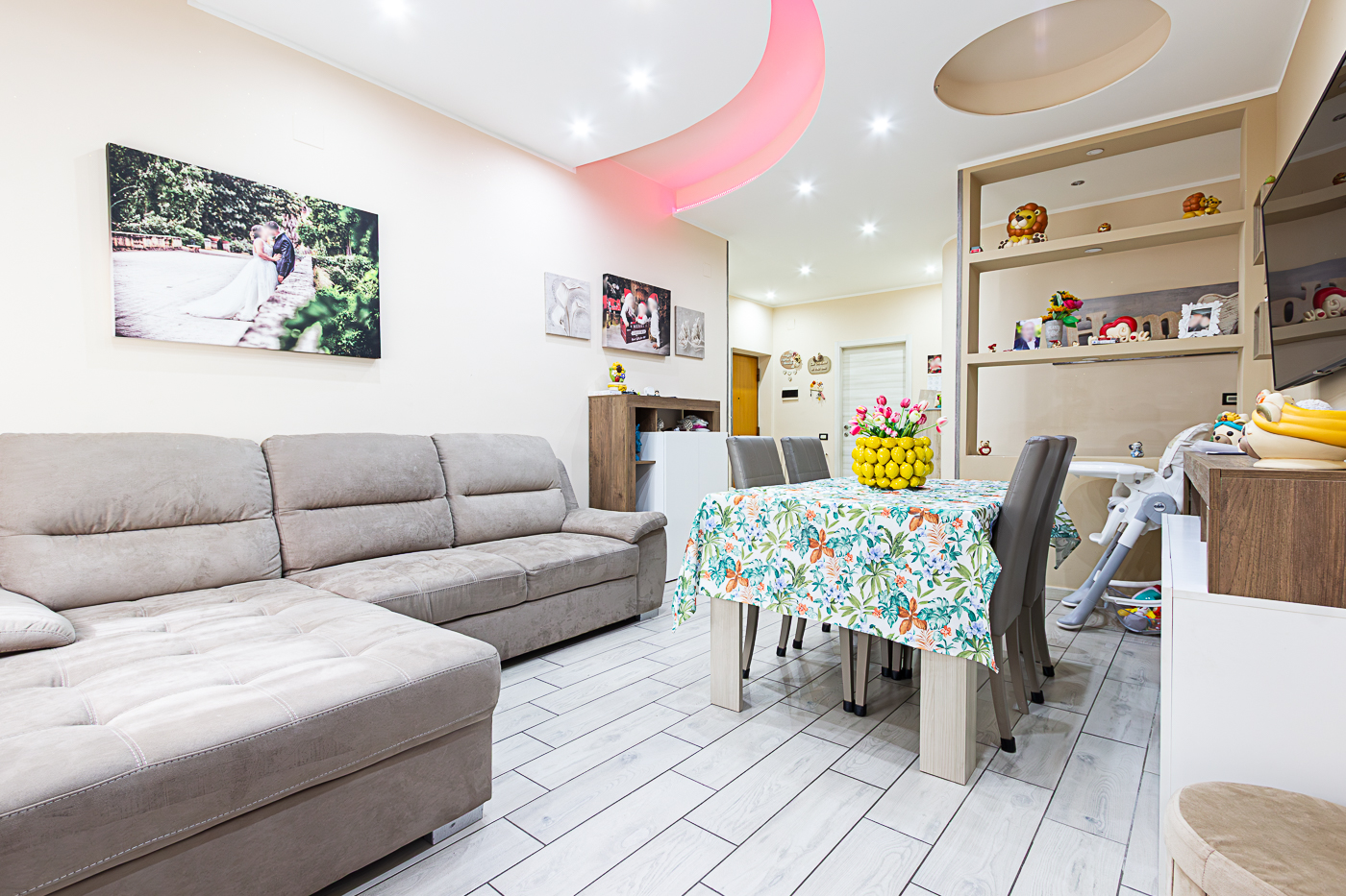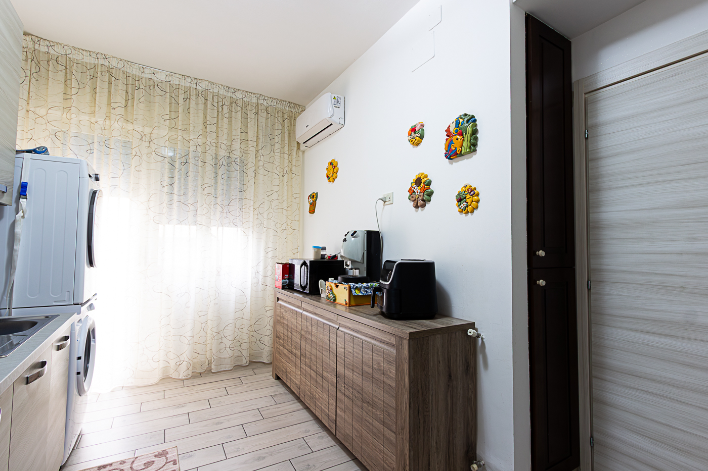 L’immobile si presenta con una distribuzione funzionale degli spazi interni ed è composto da: ingresso su soggiorno, cucina semi-abitabile, due camere da letto, servizio, due comodi ripostigli e due terrazzi, di cui uno di circa 70 mq, dotato di cancello elettrico, e un secondo di circa 10 mq, ideali per momenti di relax o pranzi all’aperto.