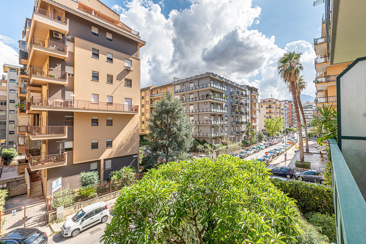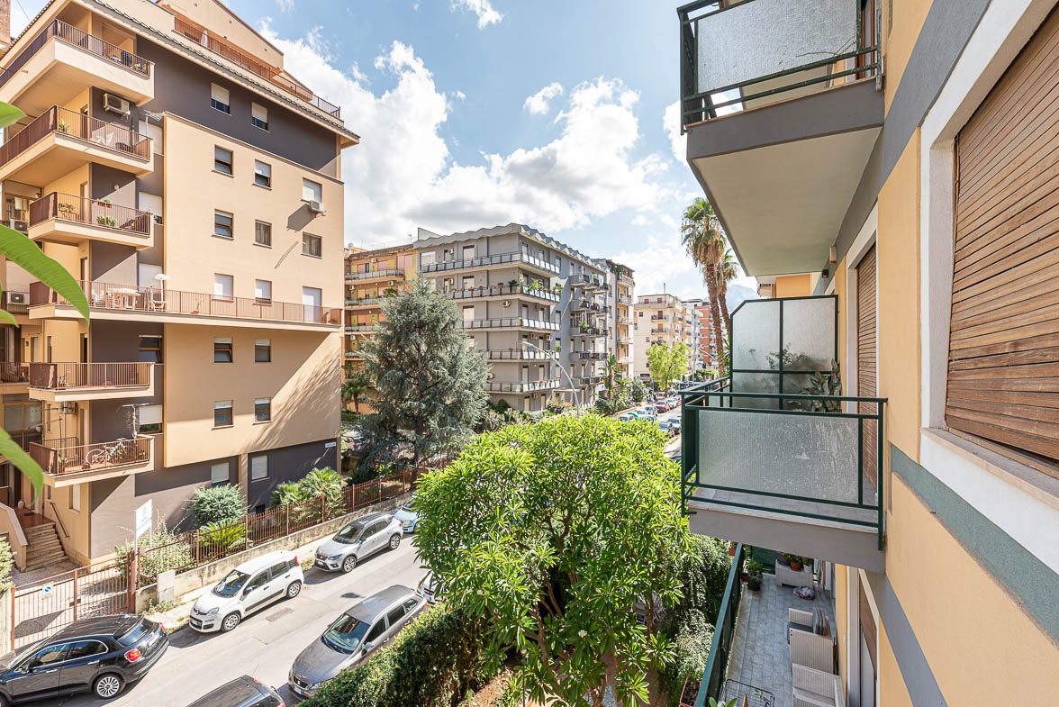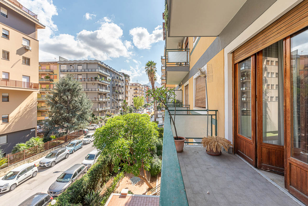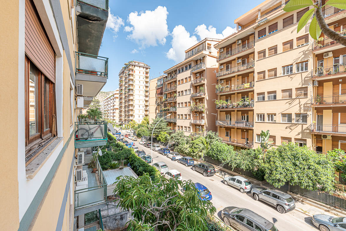 La cucina abitabile, vero cuore della casa, si apre su un balcone verandato collegato alla lavanderia, offrendo uno spazio pratico e funzionale per la gestione della quotidianità. Due bagni, ben distribuiti, completano la disposizione interna, insieme a due ulteriori balconi con affaccio su Via Val di Mazara, che donano respiro e luminosità agli ambienti principali.