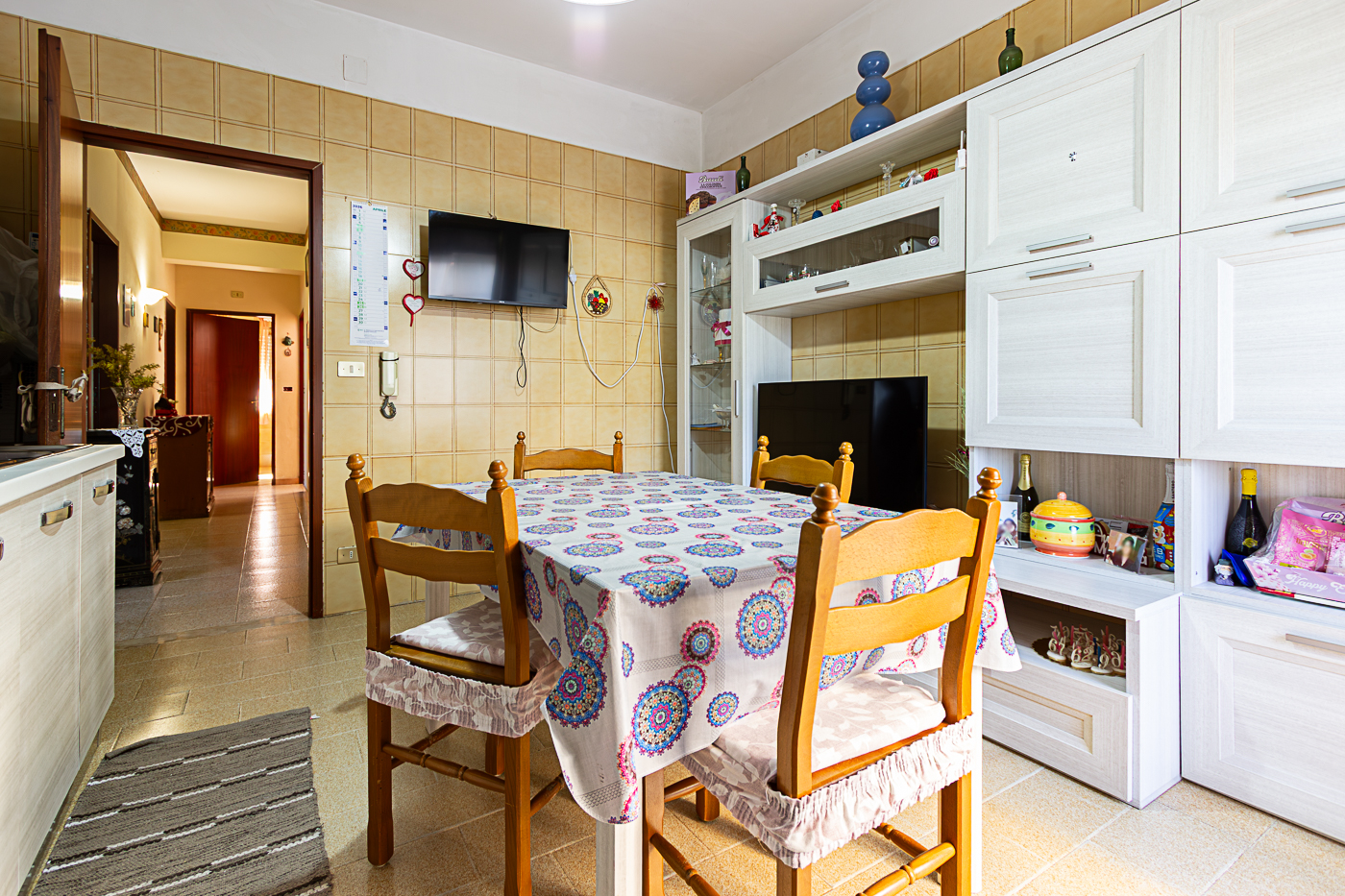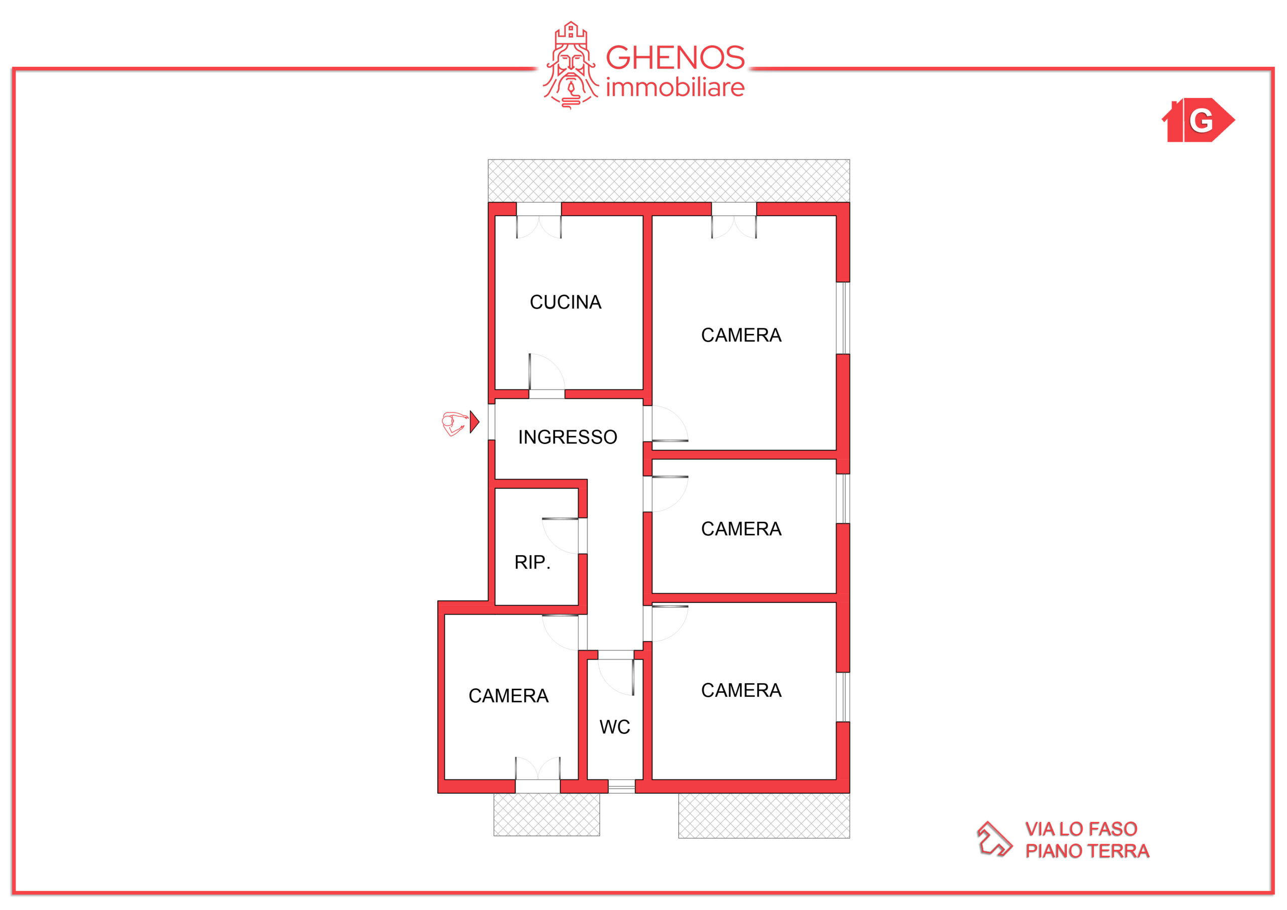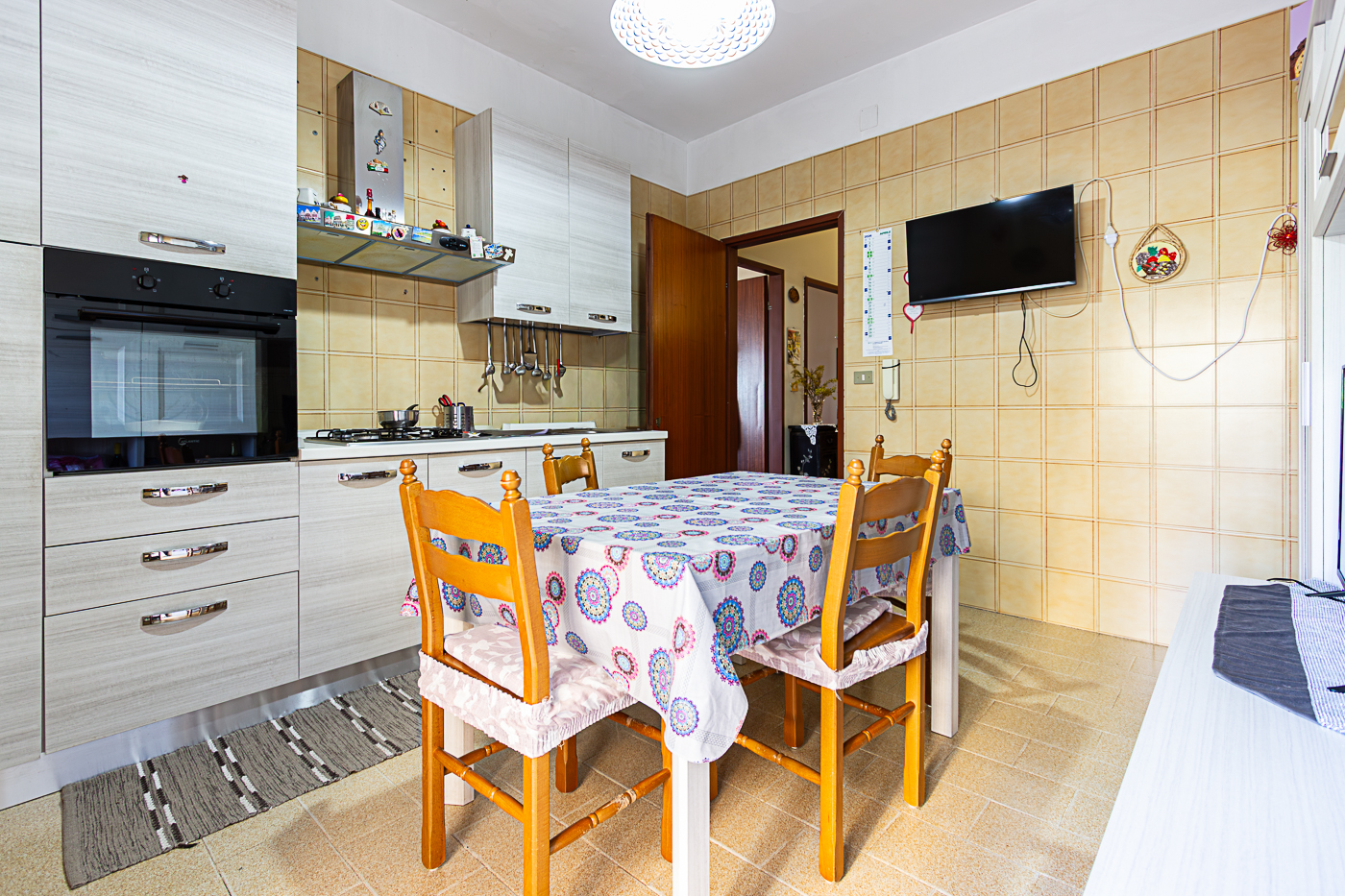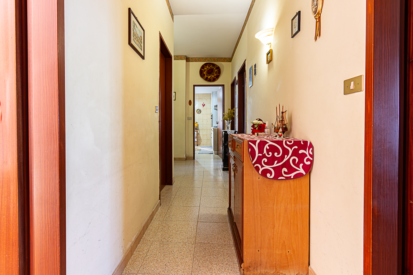 L’appartamento è composto da ingresso su disimpegno, cucina abitabile, quattro camere, un bagno e un comodo ripostiglio.