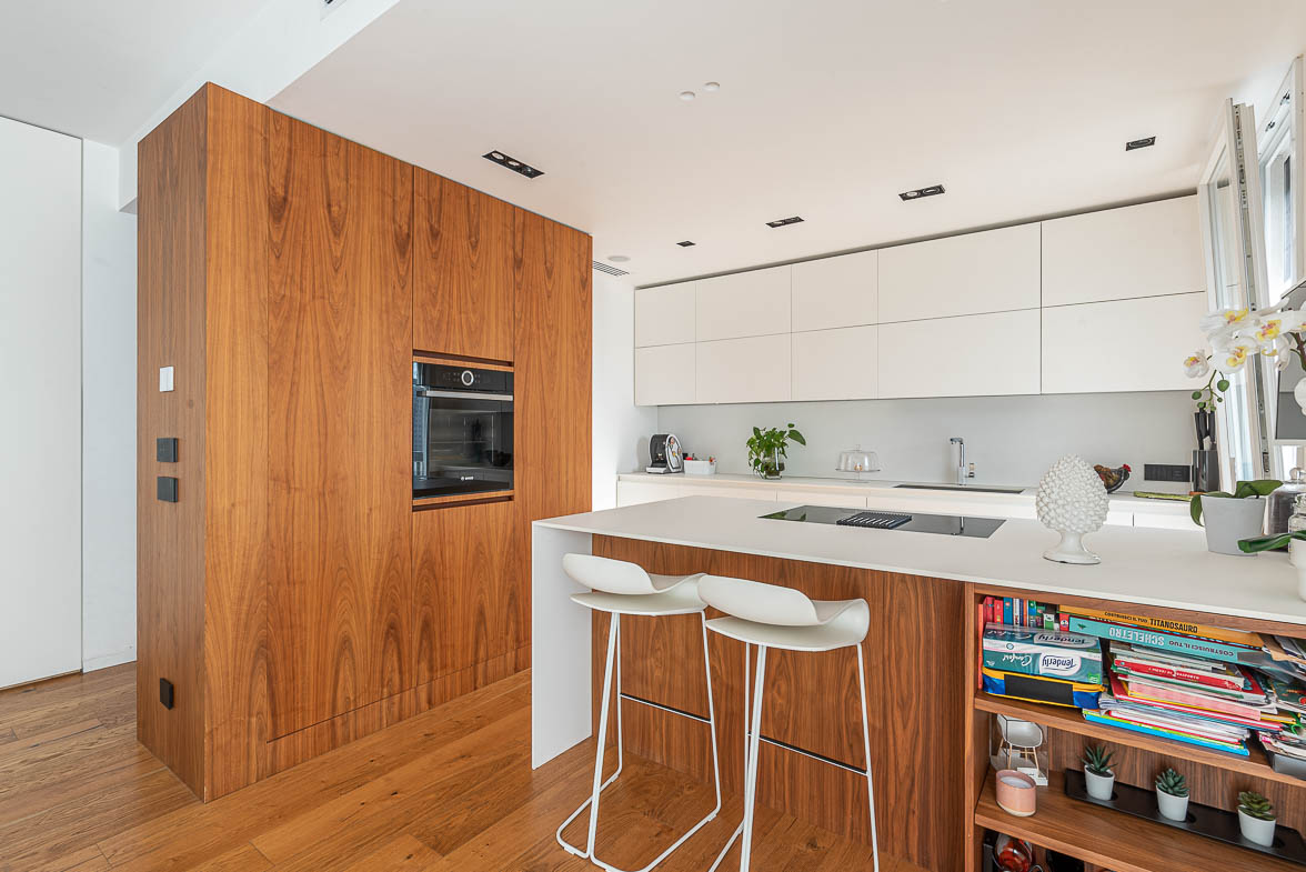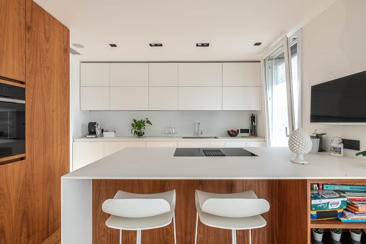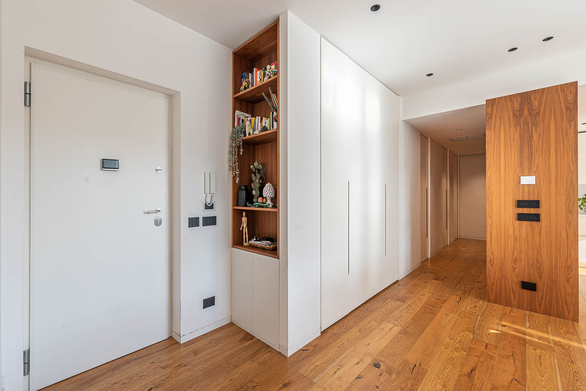 L’appartamento è interamente controsoffittato e dotato di arredi su misura e finiture di alto livello, tra cui: cucina con top in Fenix, elettrodomestici di ultima generazione, penisola con piano aspirante e pensili a tutta altezza, boiserie, armadi e mobile TV in noce canaletto, tavolo esterno in marmo marocchino, porte scorrevoli a tutta altezza, infissi esterni Korus minimal in PVC, serrande in alluminio coibentate e motorizzate, porta d’ingresso blindata con videocamera integrata (classe di sicurezza 3), parquet in rovere.