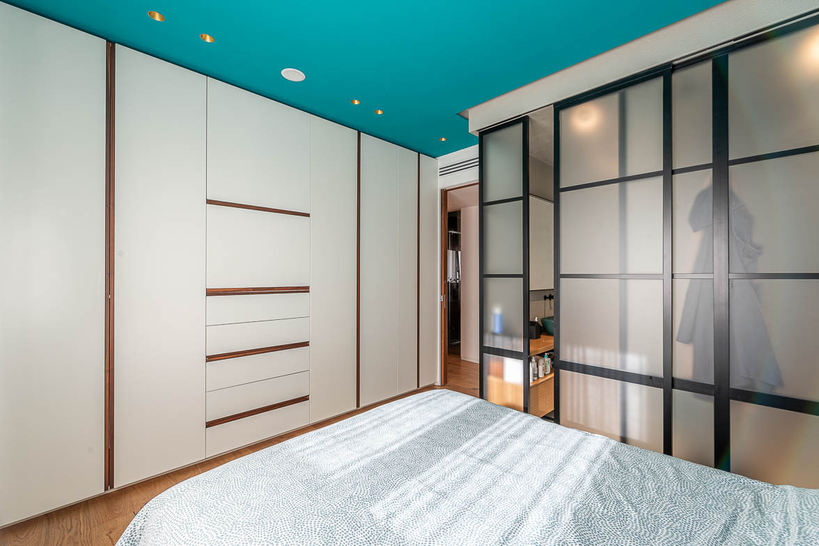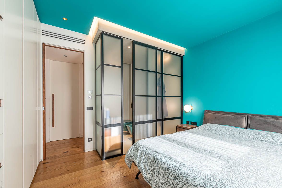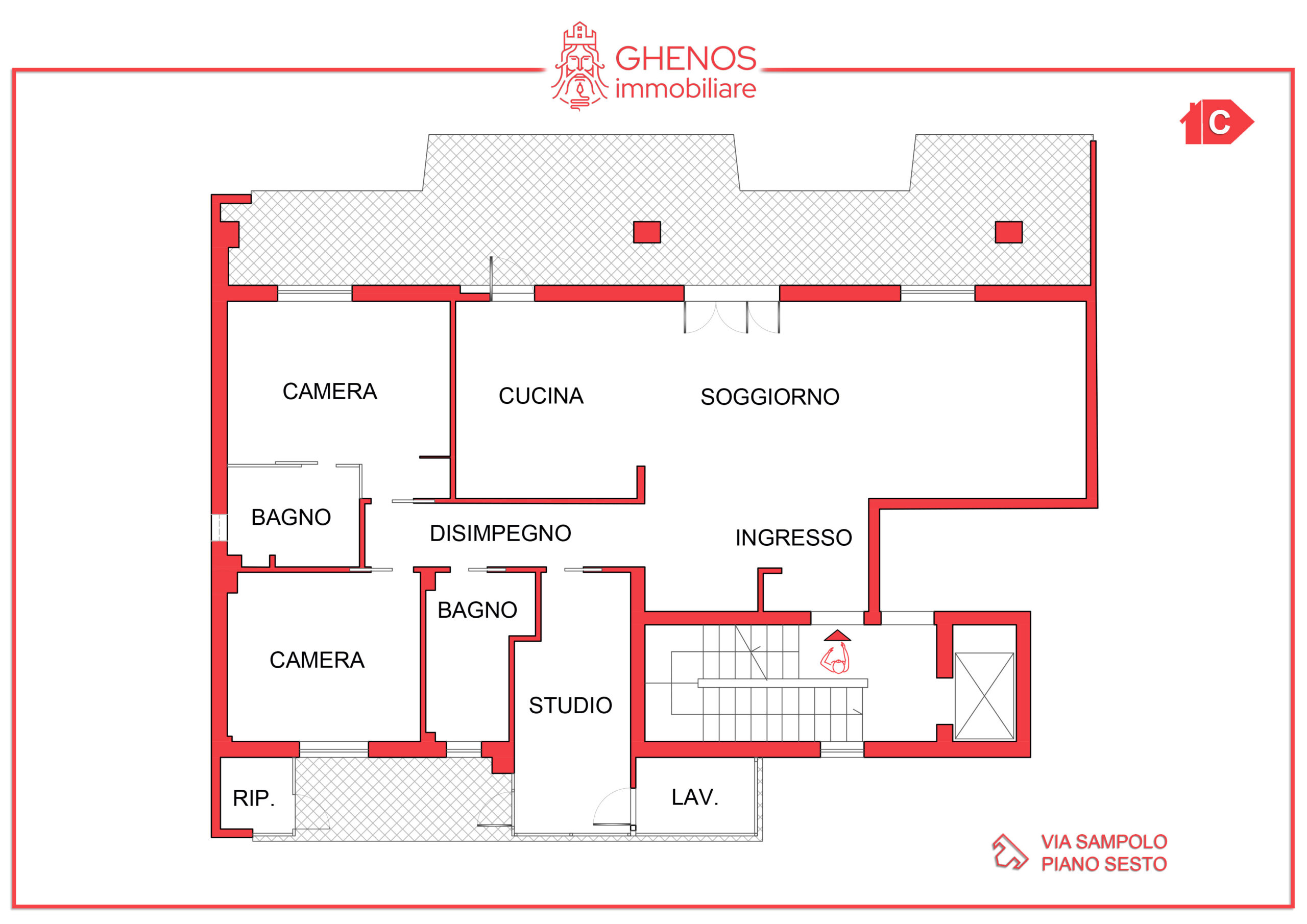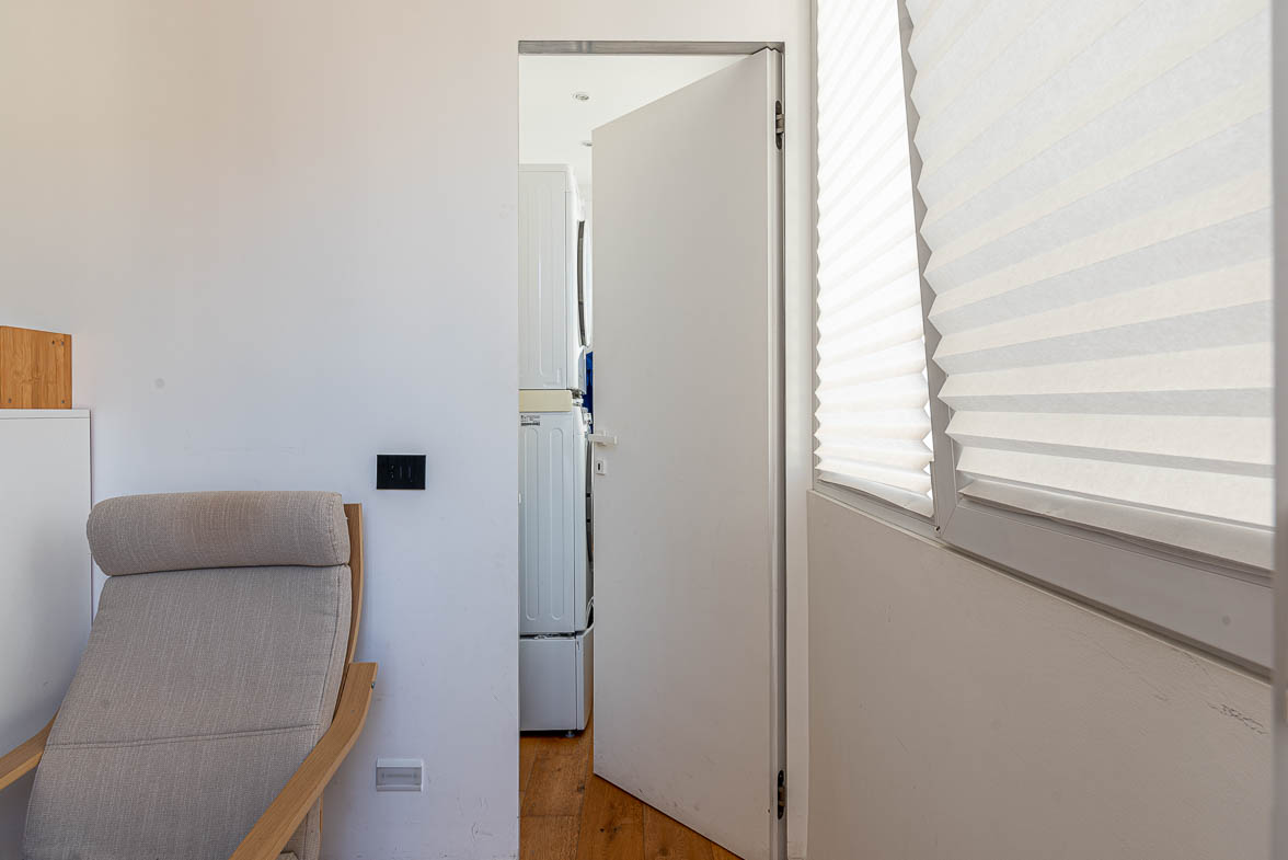La distribuzione interna dell’appartamento comprende: camera padronale con bagno en suite con doccia walk-in, cameretta con affaccio su balcone, studio, bagno principale, lavanderia e ripostiglio.